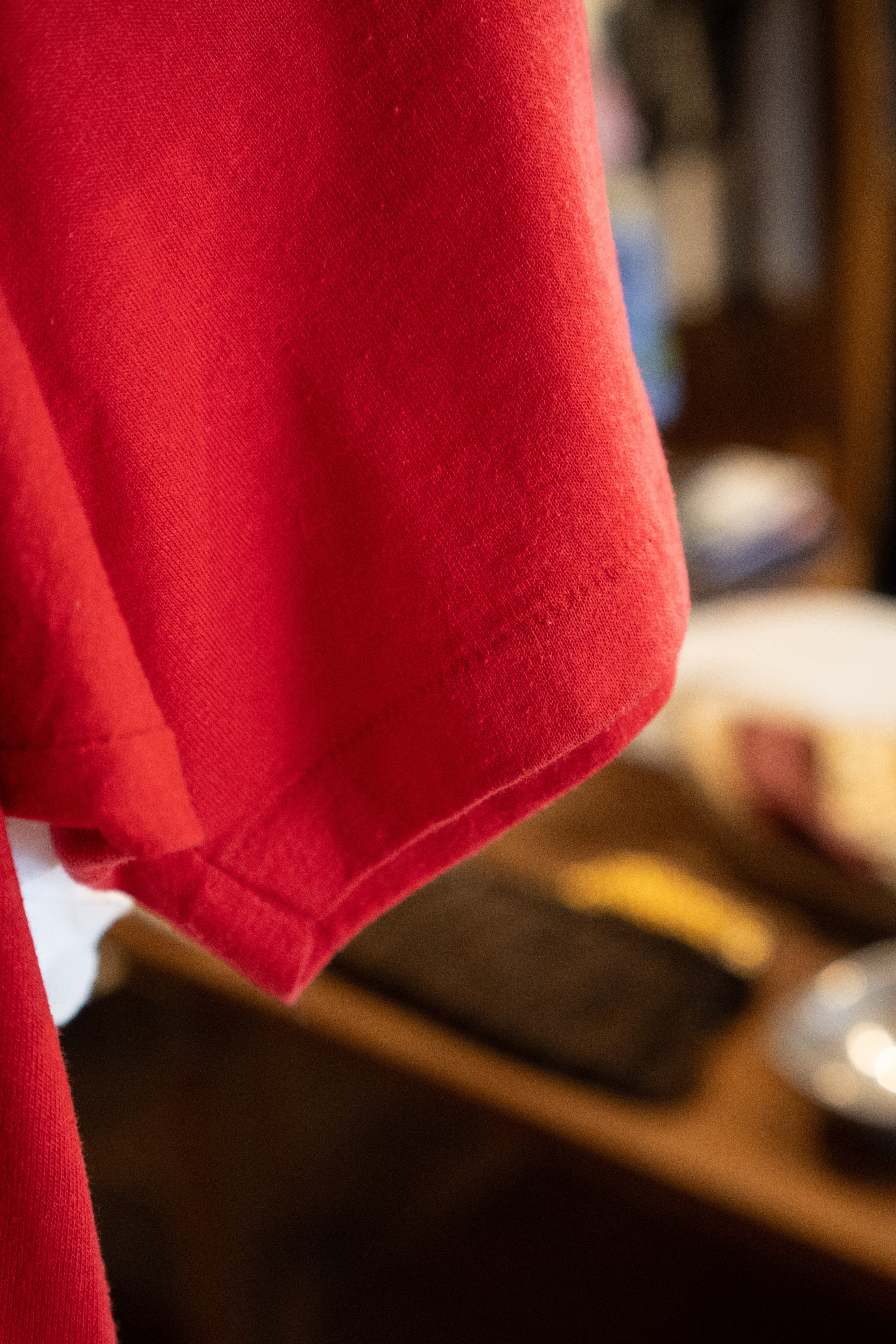 袖裾シングルステッチ、裾ダブルステッチ。